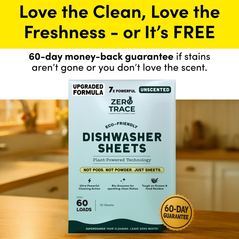 - NATURE'S ANSWER TO SPOTLESS DISHES: Fueled by plant-based brilliance, Zero Trace Dishwasher Sheets effortlessly combat grease and stubborn food marks, leaving dishes shimmering without any traces, streaks, or mineral deposits. Choose Zero Trace for a genuine, effective clean, devoid of ethoxylates, and proudly certified cruelty-free.