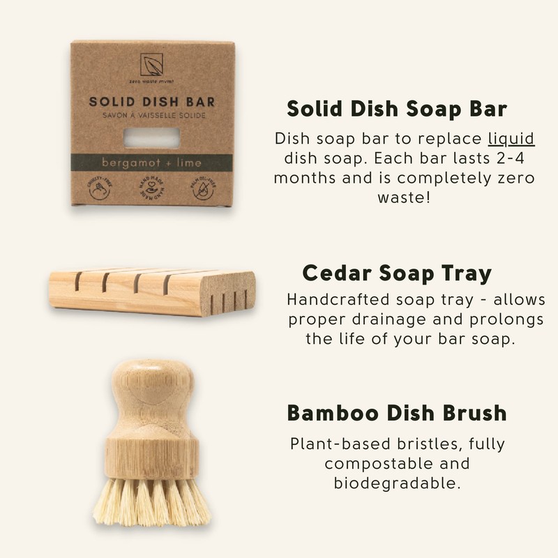 - 3pc. STARTER BUNDLE: We’ve assembled the perfect zero waste dish washing starter bundle which includes everything you need to ditch the plastic in your kitchen. Included in the bundle is our signature handcrafted Cedar Soap Tray, Bamboo Pot Brush, and our flagship Solid Dish Soap Bar.