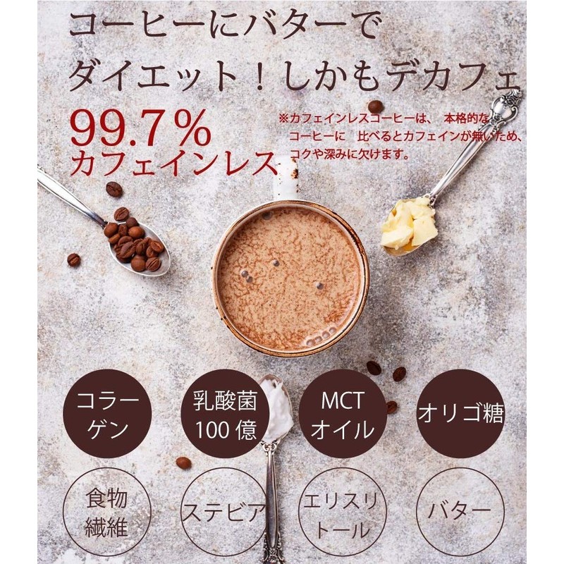 オリゴ糖、乳酸菌(EC-12、フェーカリス、ラクリス)、ビフィズス菌、 /甘味料(エリスリトール、ステビア)、香料 ※バター抹茶は、インスタンコーヒーのかわりに「抹茶」(京都宇治)を使用。 カフェインレスではありません。 - 賞味期限: 別途商品記載 内容量 :90g(1杯約3g) お召し上がり方: ティースプーン大盛り1さじ(約3g)を100〜120ml のお湯またはお水でよく混ぜて、お召し上がりください。