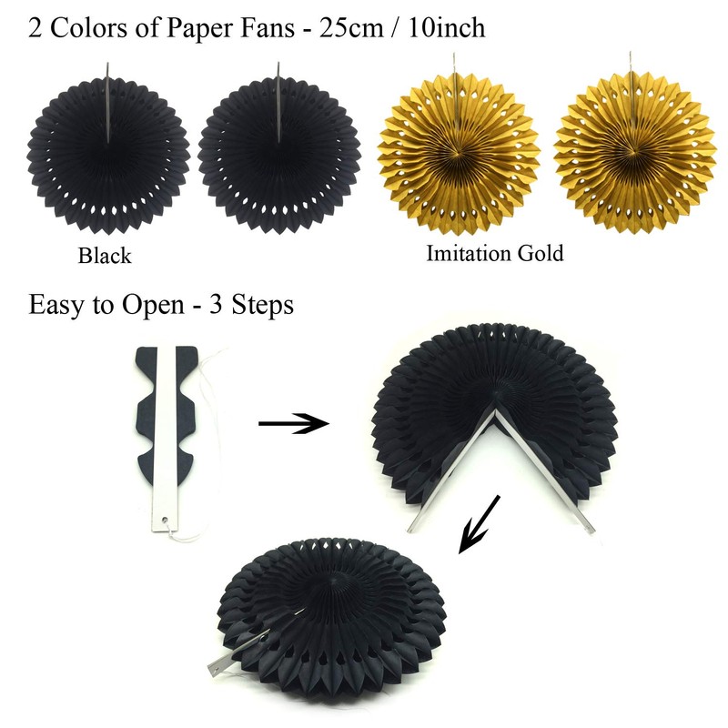 - Includes: 1 x HAPPY BIRTHDAY flags band, 1 x 6.5ft Triangular Pennants, 4 x Paper Honeycomb Balls, 4 x paper fans, 10 x Hanging Swirls, 20 x balloons birthday party supplies, 1 x 6.5ft Circle Paper Garland. ( Color: Black, gold, white and gray)