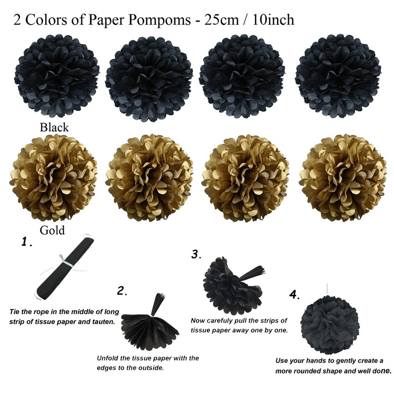 4 pieces 25 cm / 10 inch black pompoms paper flower.