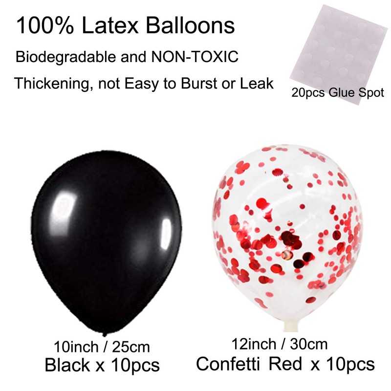 - HANGING PARTY DECORATION KIT: 10 x Red confetti balloon, 10 x pink latex balloons, 1 x 6.5ft Triangular pennants, 4 x 10inch/25cm Paper honeycomb pompoms, 6 x 10inch/25cm Paper fans, 4 x Paper hollow fans, 1 x 6.5ft Circle Paper Garland. ( Color: Red and Black)