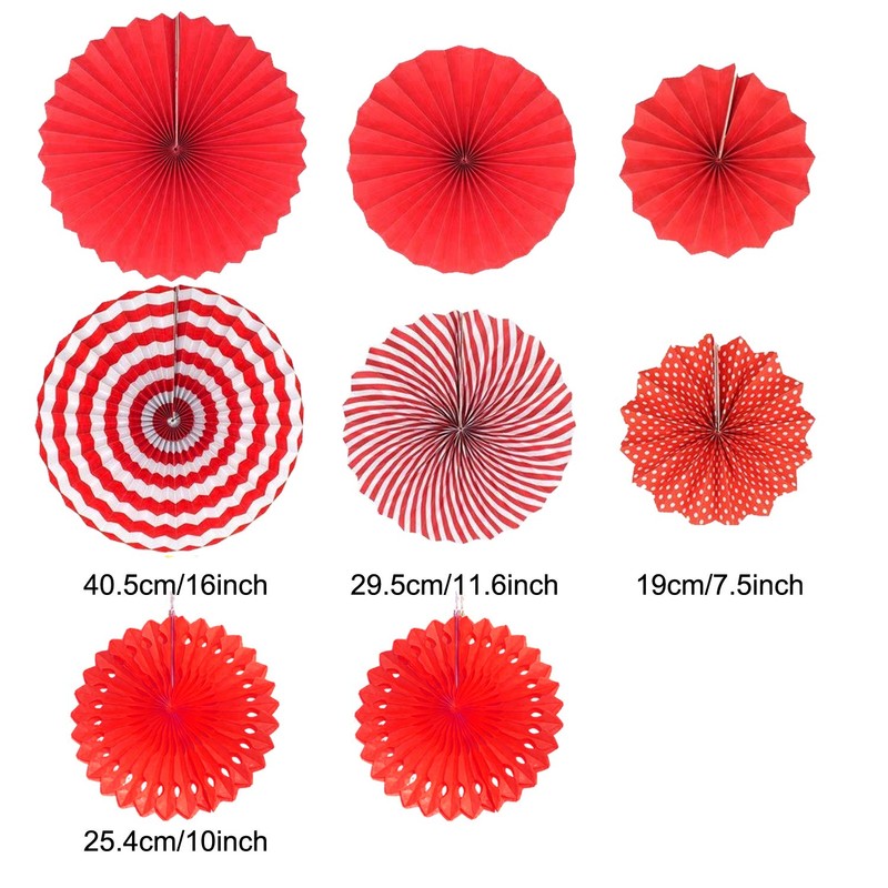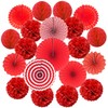 - Pack of 20 red decoration set. It includes: 8 paper pompoms, 4 honeycomb balls, 2 hanging fans flowers and 6 paper fans.