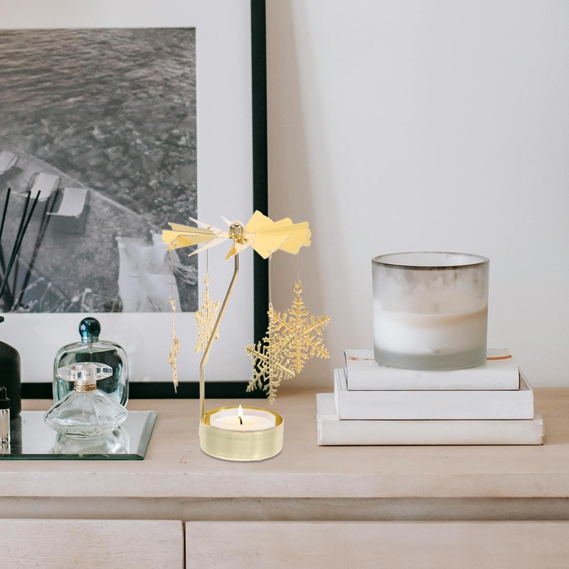 - Snowflakes rotating candle holder with tray, candle toppers accessories gold candle spinning tea light metal holder for christmas, valentines day, party table decor, this candleholder is a good choice for creative decoration in coffee shops, bars and internet cafes.