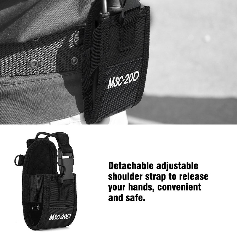 Are you still placing your walkie-talkie when you are working, and holding it in your hand will hinder your work? This walkie-talkie leather case can be used to wear the walkie-talkie in different ways, liberating your hands and allowing you to work hard. It's made of fine Nylon material fabrics with fine workmanship, Nylon material are effectively protected and protected damage from the outside world, light and durable. Waist, chest hanging, shoulder hanging available. Excellent solution for outdoor sports. Widely used in police stations, military, hospitals, security offices, restaurants and many other places. Adjustable shoulder broadband, can be adjusted once, without having to adjust each time to facilitate hanging. 3-in-1 design (hand/belt/neck), making it suitable for police, firefighters, security guards, emergency personnel and other needs. It can accommodate small devices such as mobile phones, GPS, inter-phones and hand-held two-way radios, not just intercoms. **Specifications:** Model: MSC-20D Color: Black Material: Nylon Shoulder strap length: Approx. 1.6m / 5.2ft Size: Approx. 125 x 63 x 35mm / 4.9 x 2.5 x 1.4inch Package weight: 79g **Package Included:** 1 x Radio Case (Radio is NOT included) **Note:** 1, Please allow small errors in the dimensions due to accidental imprecise manual measurement. 2, For this electronic product, please care don't touch the water when you use it, or the circuit will be damaged and has a shorter service life.