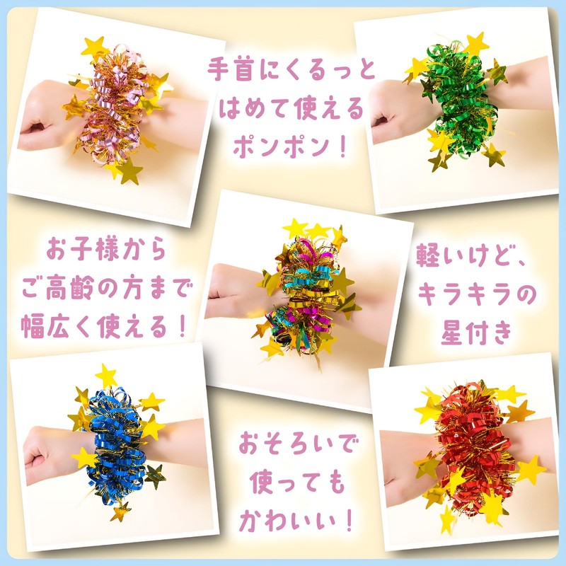 - Pompoms that can be worn comfortably around your wrist. Light but with a shiny star plated tape that gives you plenty of presence. You can use both hands while wearing it. Anyone from children to the elderly can enjoy this fun piece of jewelry