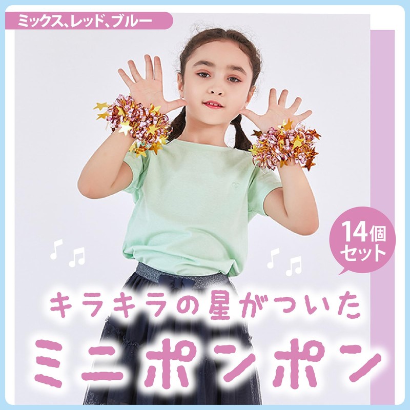 - Set of 14 mini pom poms with sparkling stars. Hand free type that can be worn on your wrist. This cute pom pom can be used as a cheering item for sports, events, or as a dance item