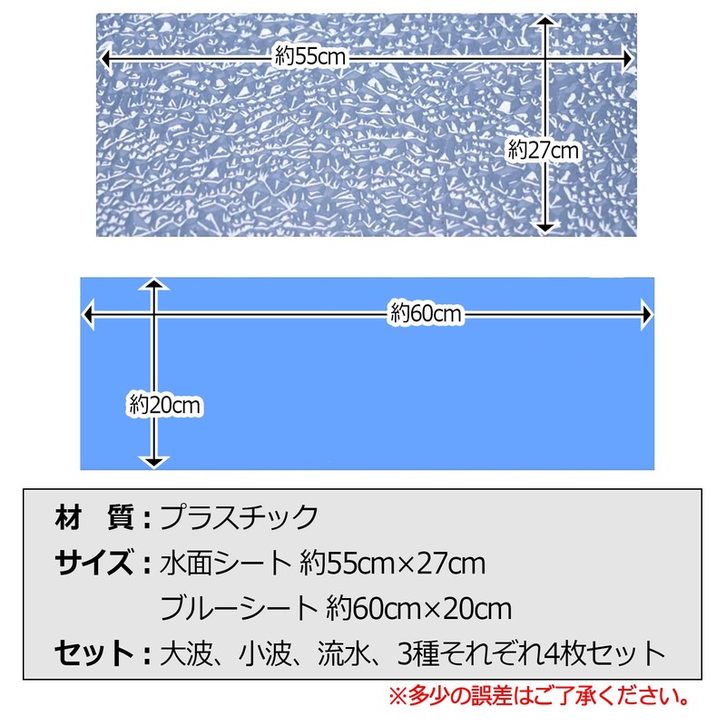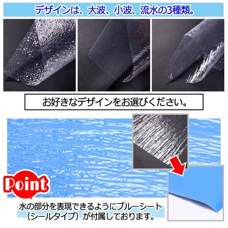 Comes in three different designs, including large waves, small waves, and running water. Choose the design you like. Includes a blue sheet (sticker type) to show the water part.
