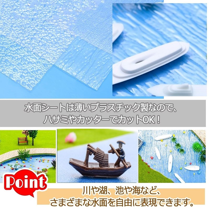 Made of thin plastic, so it can be cut with scissors or cutter. You can freely express different surfaces such as rivers, lakes, ponds and oceans.