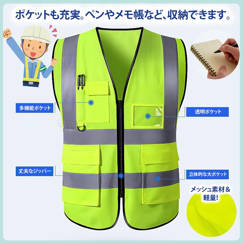 Mesh material & lightweight. You can move around easily even when you wear it over your cold gear during the hot season, or in the cold season. It has plenty of pockets. It can hold pens, notepads and other supplies you need for work.