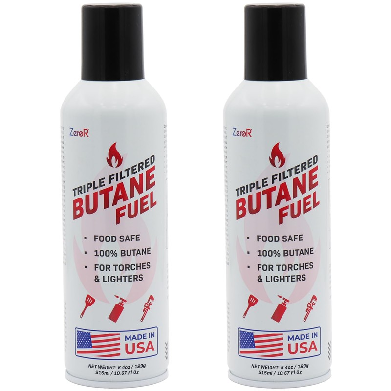 ZeroR Triple Filtered Butane Refills fill the gaps between size and quality. Our butane fuel is 100% pure iso-butane, Food-Safe, and is Made in the USA. Net Contents: 10.67 fluid ounces. Net Weight: 6.4oz. For use with kitchen torches, refillable butane lighters, and any butane blow torch with a gravity feed fuel nozzle.