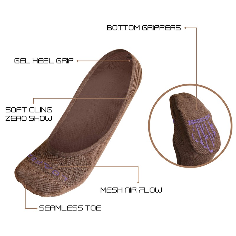 ZeroSock Bamboo Viscose Ultra-Low No Show Socks (4 Pairs Per Box), Brown, 5-8.5