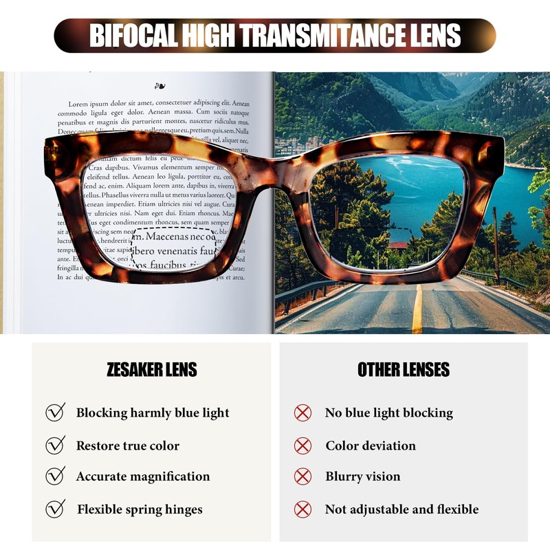 • BIFOCAL READING GLASSES- The ZESAKER reading glasses feature a convenient bifocal lens, offering two vision zones for seamless reading and distance viewing. The upper part with 0 strength for normal vision, while the lower portion with the strength you selected ensures clear focus on books, phones, and screens- perfect for multitaskers!