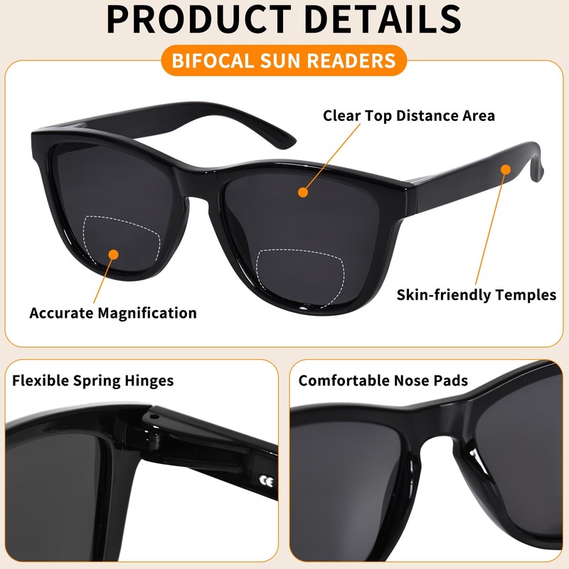 - COMFORTABLE WEARING- The ZESAKER bifocal reader sunglasses are made of high quality poly-carbonate frames, flexible spring hinges, an anti-reflective lens coating, and scratch-resistant lenses, all details effectively reduce eye fatigue, headache, dizziness, insomnia, and eyestrain, further ensuring all-day comfort
