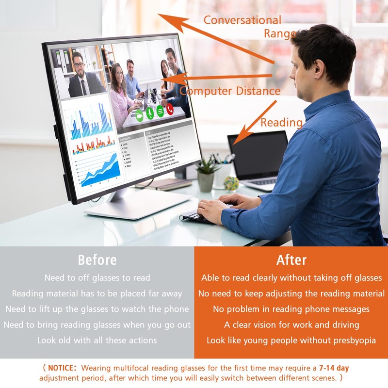 - NOTE : Before selecting the correct magnification, it is recommended to consult an optometrist for accurate magnification recommendations. Otherwise, the multiple is too strong or too weak, will cause blurred vision or dizziness. Please choose carefully. After the age of 40, vision changes from year to year and requires the attention of the buyer. For first-time multifocal reading glasses wearers, it can take one to three weeks to get used to.