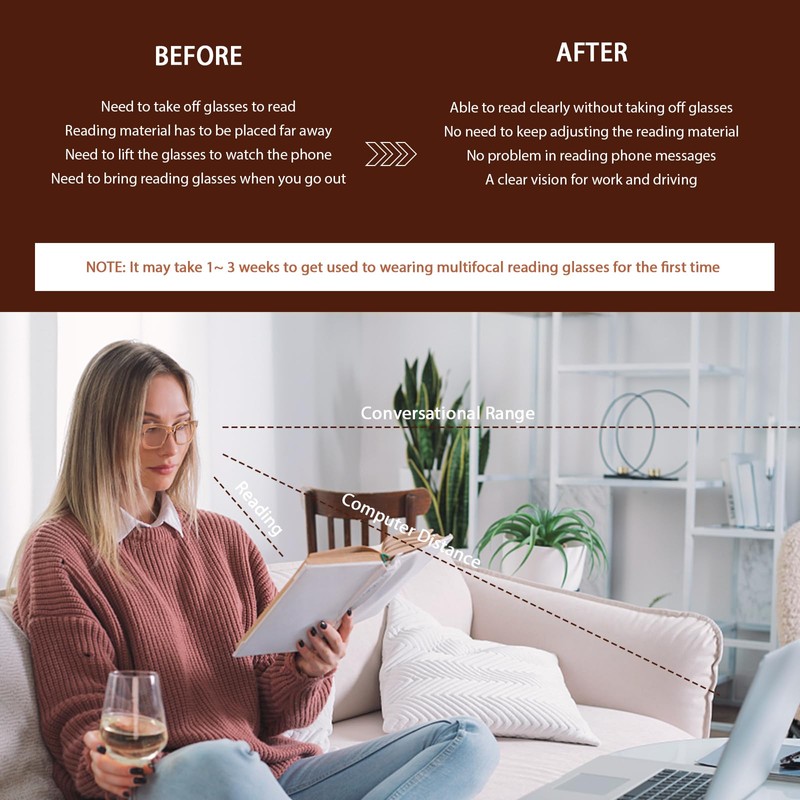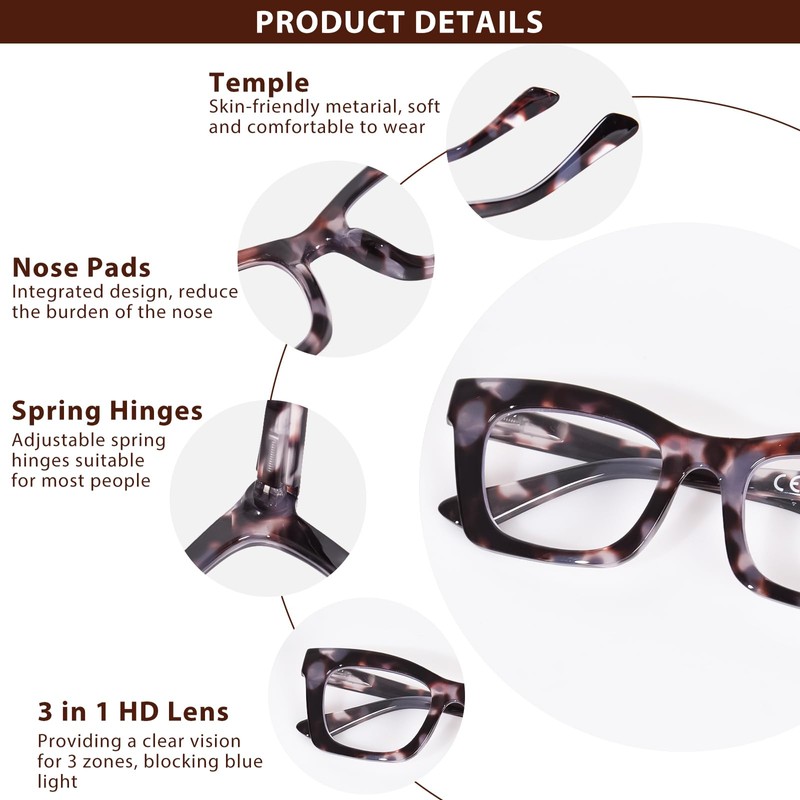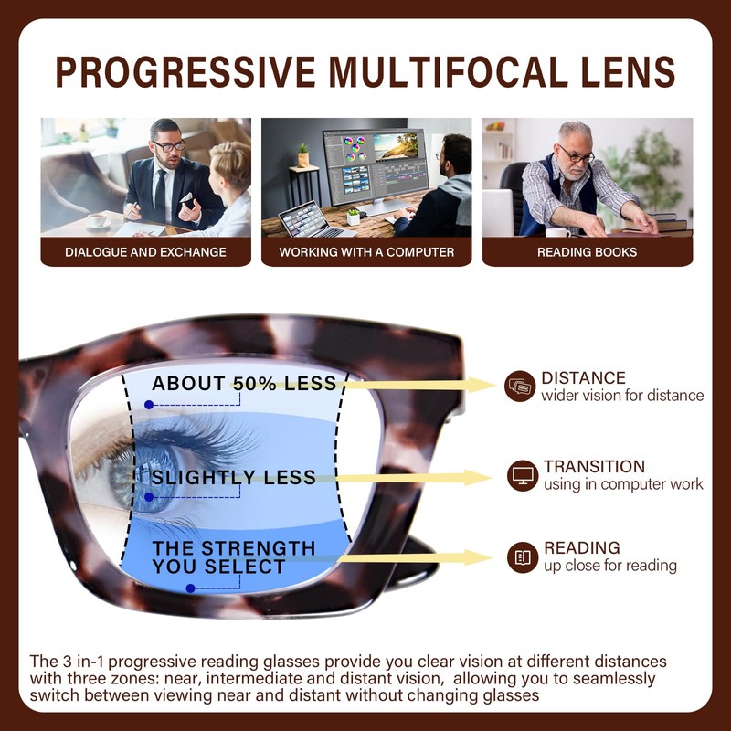- STYLISH & CLASSIC READING GLASSES- The durable oversized poly-carbonate frames and flexible spring hinges make it perfectly fit for most kinds of face shapes, with no slip on nose or pinch on ear. Also, our progressive multifocus reading glasses are designed in fashionable oversized square frames and classic color, stylish and trendy for blue light progressive readers, and you can even wear them at social, office settings, and formal occasions