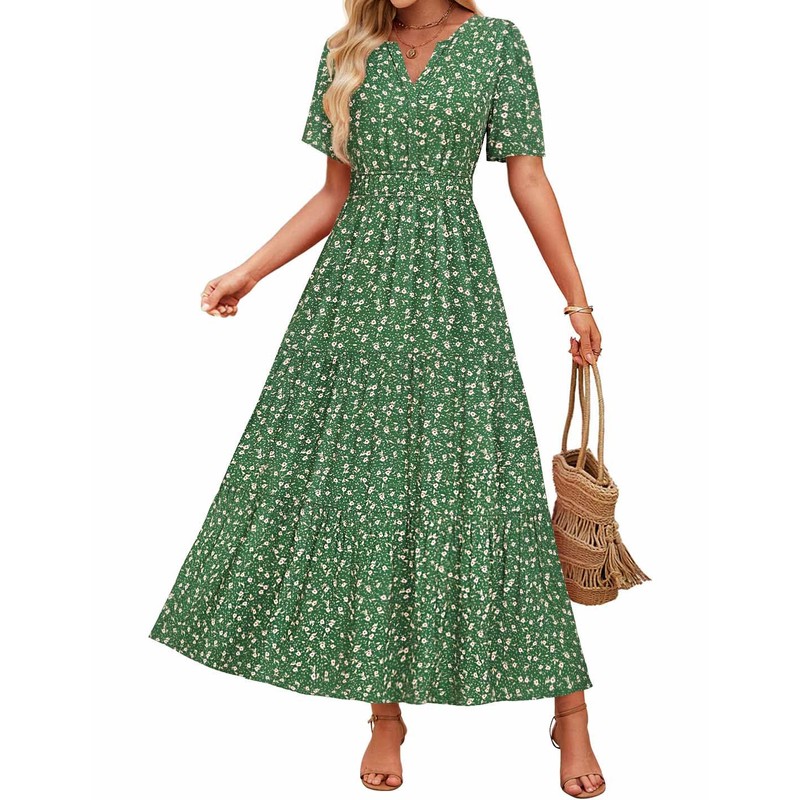 ZESICA Women's 2025 Summer Casual Floral Print Short Sleeve V Neck High Waist A Line Tiered Flowy Boho Maxi Dress,Green,Large