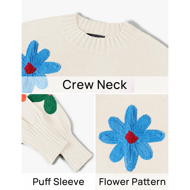 ZESICA Women's Long Puff Sleeve Sweaters Casual Crewneck Ribbed Knit Flower Color Block Loose Pullover Tops,Ivory,Medium