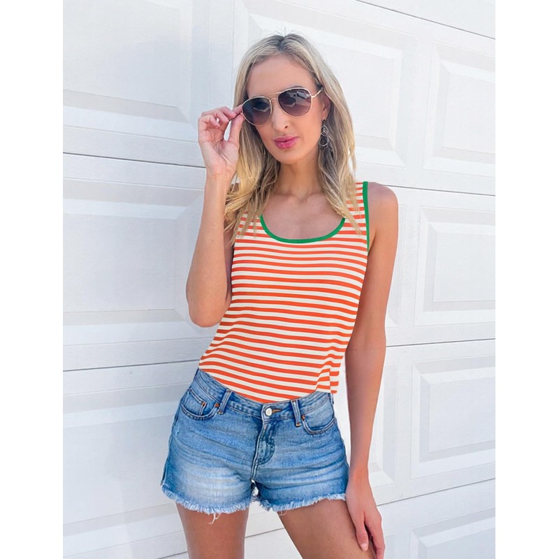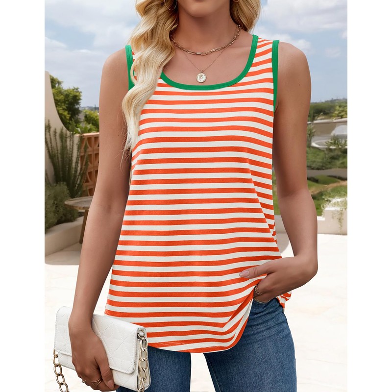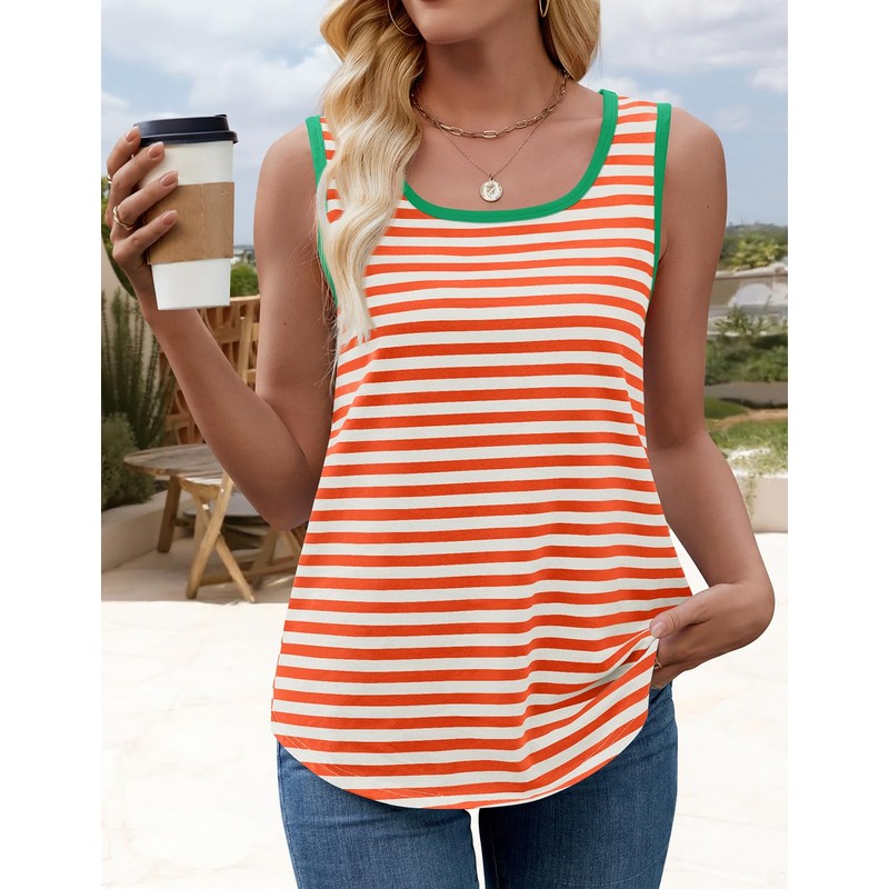 ZESICA Women's Summer Casual Striped Tank Top Sleeveless Scoop Neck Loose Fit Color Block Tops 2025 Fashion Clothes,Orange,X-Large