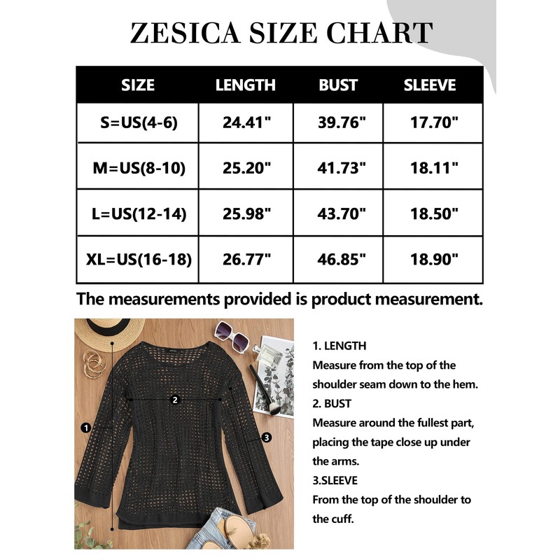 ZESICA Women's Summer Crochet Hollow Out Long Sleeve Beach Bikini Swimsuit Mesh Cover Up Tunic Top,Black,Small