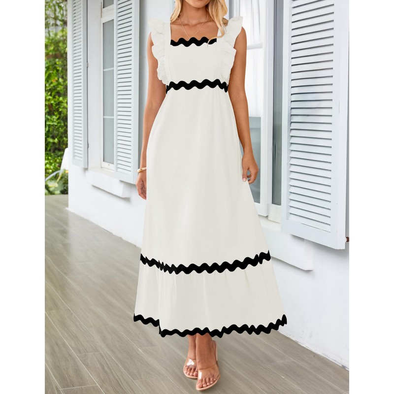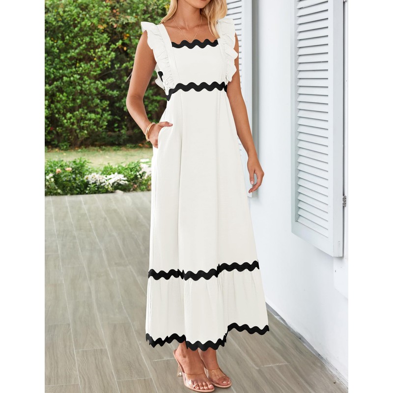 - Features: Square neckline, ruffle sleeveless, high waist, with pockets, midi long length, elastic smocked back, backless, rickrack trim, a line shape, flowy swing hem, loose fit sundresses for women. Our womens dresses is made of cozy, lightweight fabric to be a fashion spring dresses, summer dress.