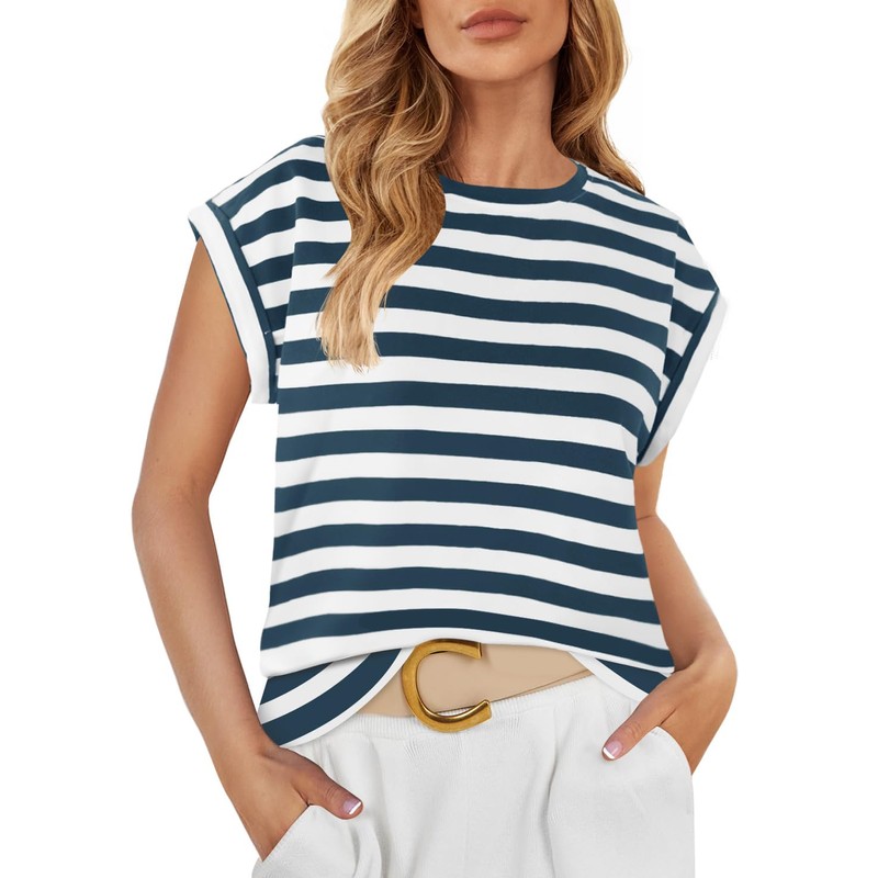 ZESICA Womens Summer Cap Sleeve Crewneck Tops Casual Loose Striped T-Shirts Basic Tees,Dustyblue,Medium