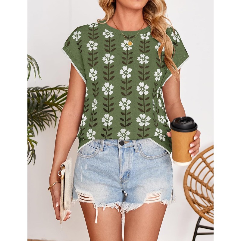 ZESICA Womens Summer Casual Printed Tops Cap Sleeve Crew Neck Cute Knit Sweaters 2025 Trendy Clothes Outfits,Dusty Green,Large