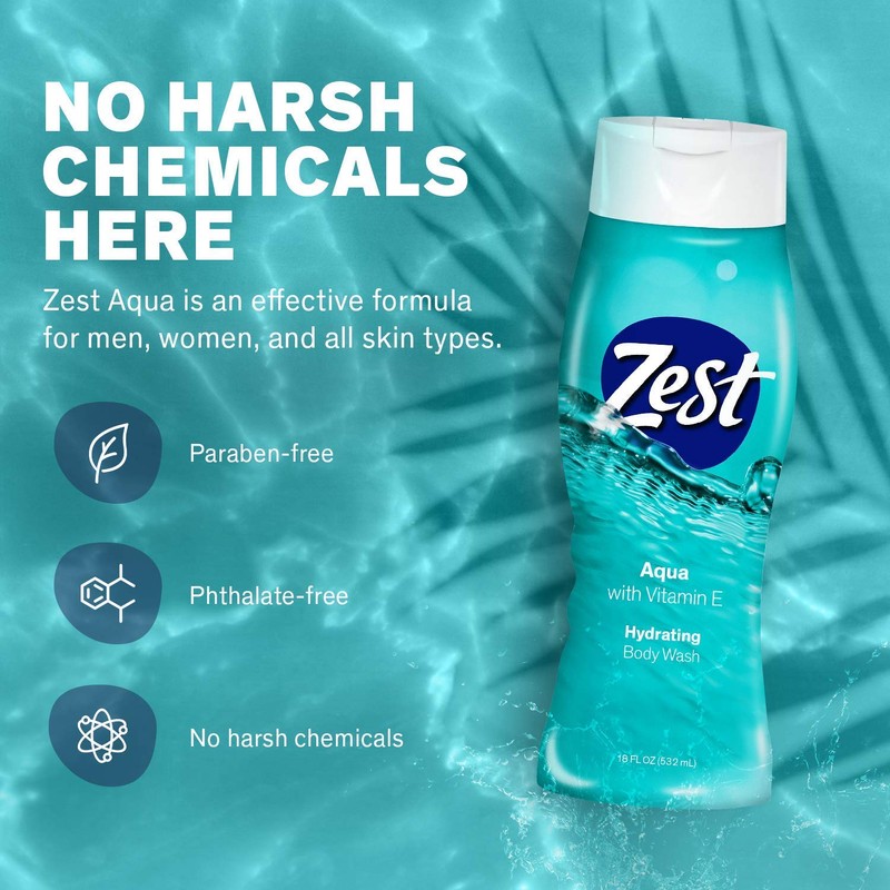 - CLEAN ZESTFULLY: Splash, refresh, repeat! Enjoy the classic scent of the Zest Aqua body wash with its clean-rinsing formula and invigorating fragrance. Start your day with this refreshing burst of clean before your hike, interview, or coffee date. You’ll be ready for anything. Each bottle contains 18 fl oz.