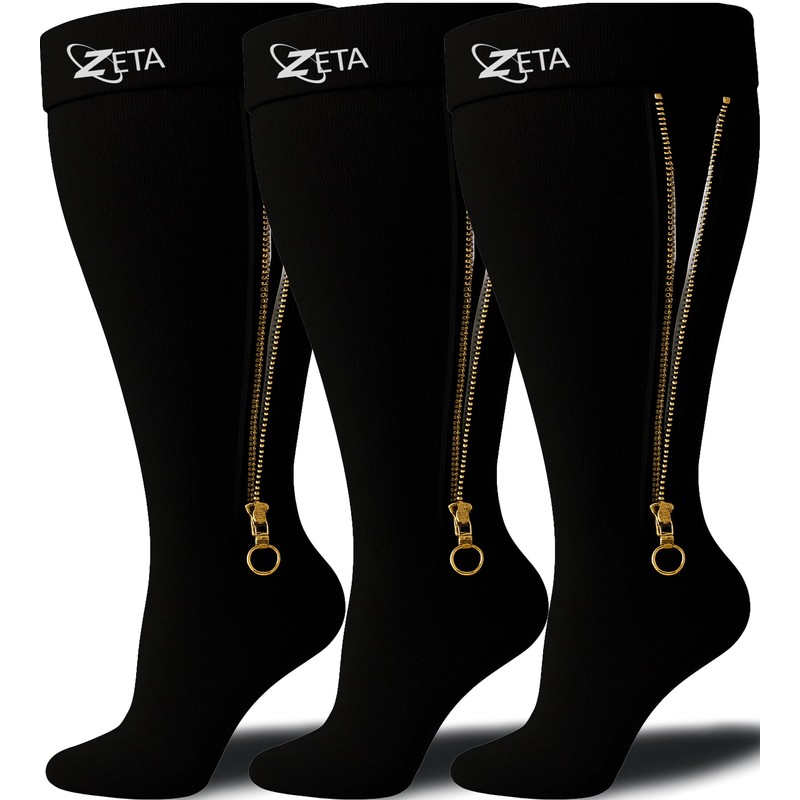 Zeta Wear Plus Size Zipper Support Socks - Wide Calf Graduated Compression for Women, Men, Seniors - Black, 3XL