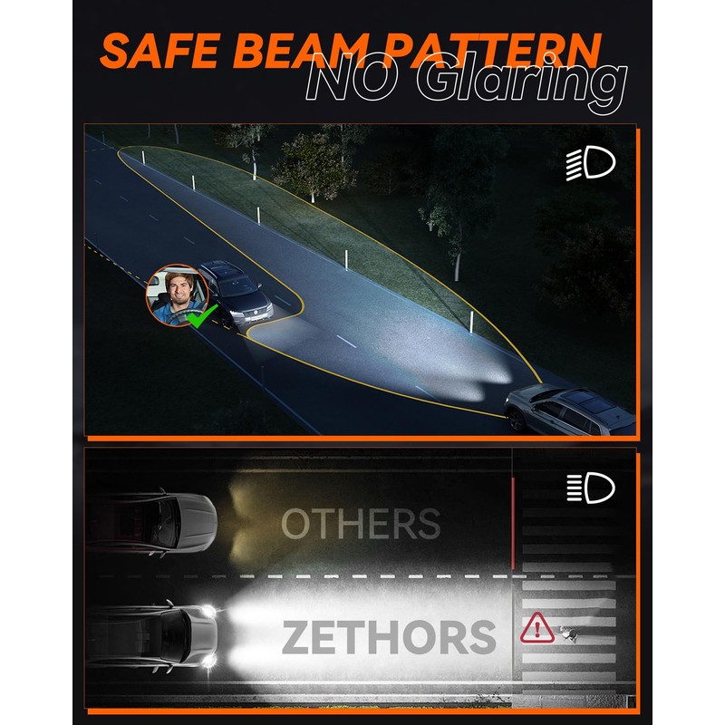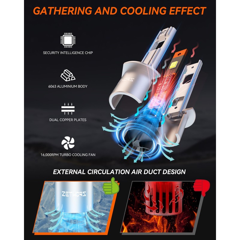 - 【Upgraded Noiseless Fan Design】 Increasing fan cooling while increasing brightness better reduces overheating and light decay, which means longer lifespan, lower replacement frequency and maintenance cost. Say goodbye to dimly lit roads and enjoy a safer, brighter driving experience with Zethors H1 headlights.