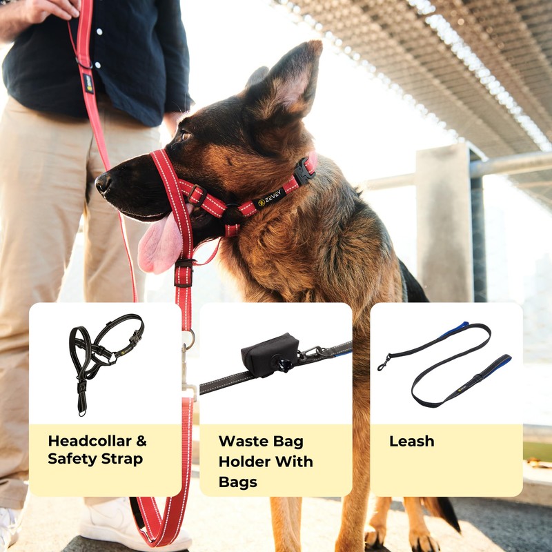 - All-in-one - full set of gentle leader with leash, poop bag holder, poop bags, and a safety strap