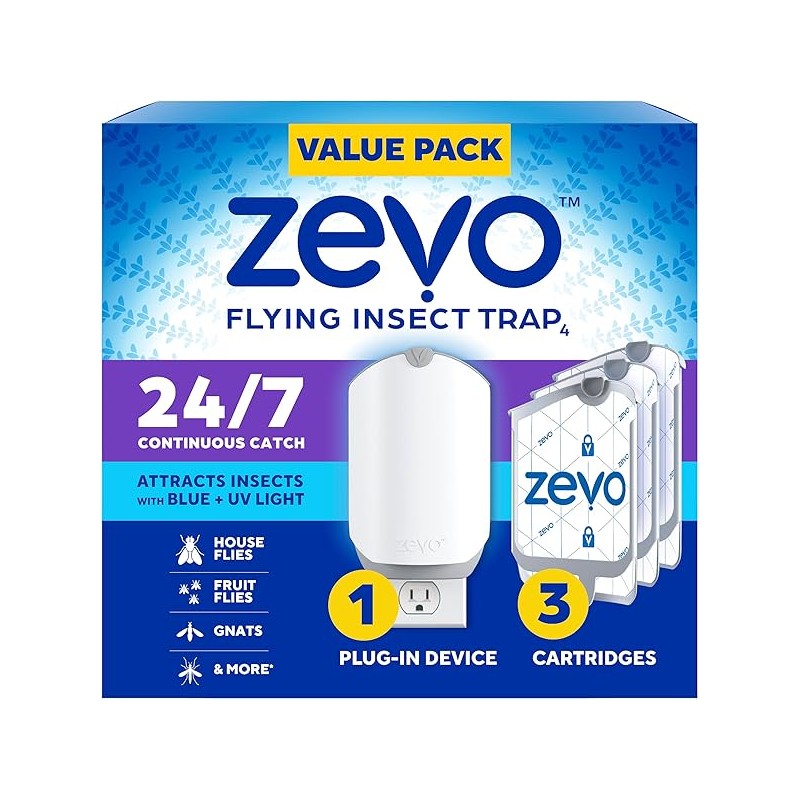 Zevo Flying Insect Trap & 3 Cartridges - Plug in Fly Trap & Indoor Bug Catcher for Gnats, House & Fruit Flies - Mess-Free - Use in Any Room - Uses Blue & UV Light (1 Plug in Device & 3 Cartridges)