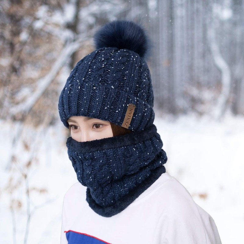 ZEXIAN Womens Girls Winter Warm Pom Knit Ski Beanie Hat and Scarf Set (Navy Blue)