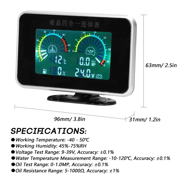 - Instrumento de automóvil 4 en 1, indicador de presión de aceite integrado, indicador de temperatura del agua, indicador de combustible y voltímetro, con pantalla digital LCD, clara y fácil de ver