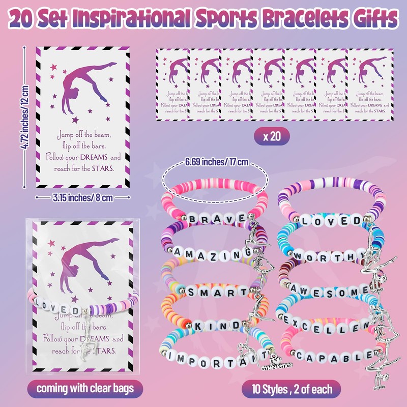 - Versatile Gifting: with 20 gymnastics bracelets, 20 cards, and 20 bags in one package, they are ideal for gymnastics parties as treats, suitable for graduation celebrations, and can be used as gifts for gymnastics - loving friends or teammates; As gymnastics gifts, they can be given on birthdays, holidays, or other special moments to show your care