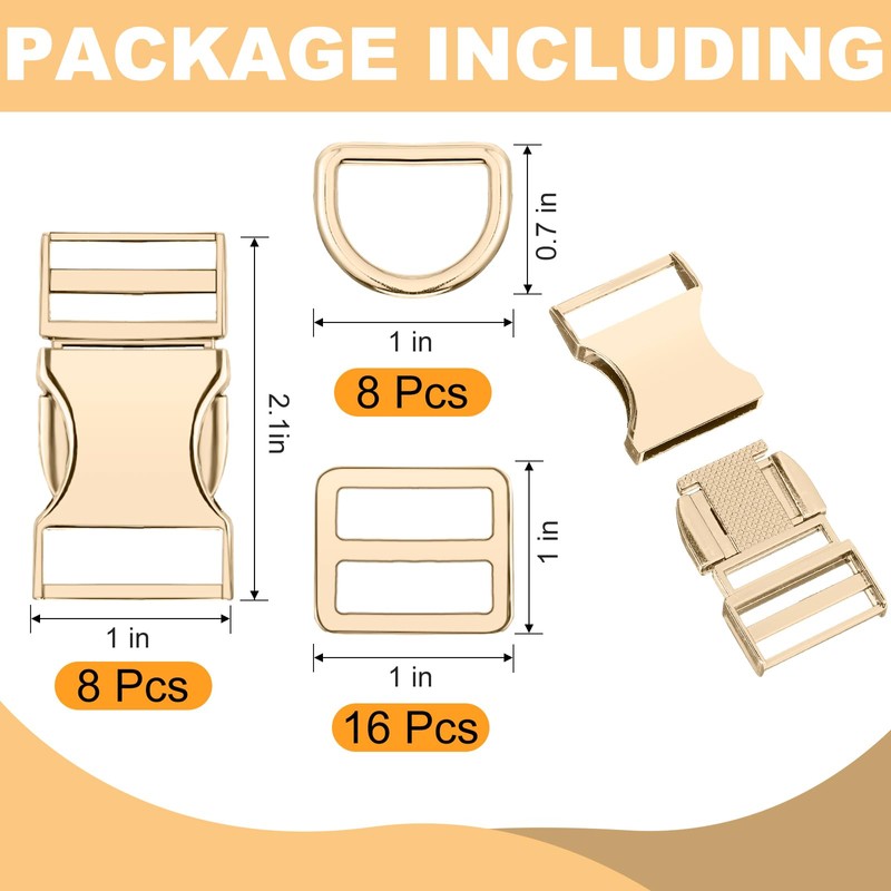 - 1 Inch Metal Buckles Set: you will receive 8 pieces of 1 inch side release buckles, 8 pieces of 1 inch D rings, and 16 pieces of 1 inch Tri glide slides buckles, suitable for 1 inch/ 25 mm wide webbing or straps, please check the size carefully before purchasing