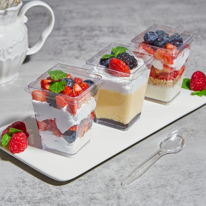 Each square clear plastic cup is made of heavy-duty plastic with high transparency. These mini cups with lids are great for serving desserts to your guests at caterings and parties. Perfect way to showcass your delicious parfaits, mousse, jello shot, appetizers and much more.