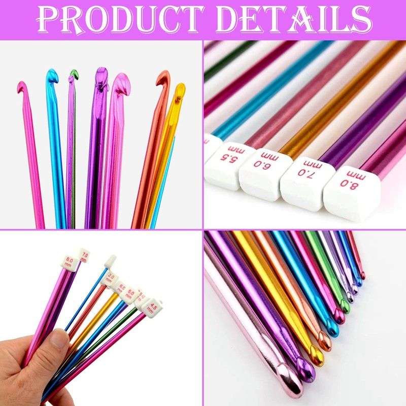 - Premium aluminium crochet hook: Each knitting needles is well made and is made of high-quality aluminium material. The hook head is strong and durable, lightweight, feels smooth and you don't have to worry about the yarn getting stuck during the knitting process. The ergonomic design with bead hook helps you knit faster and is less unpleasant when working with your hands for a long time.