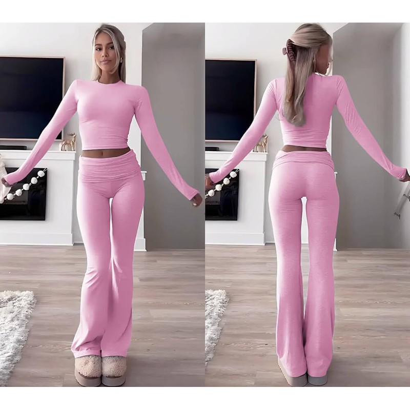 - FEATURES: Experience ultimate comfort in this 2 piece lounge set, featuring a soft and high-stretchy material that provides a body-hugging fit for a casual yet sexy look.The fitted crew neck long sleeve top and fold-over low rise flare pants create a flattering and breathable ensemble, perfect for everyday wear or as a lounge top or base layer.