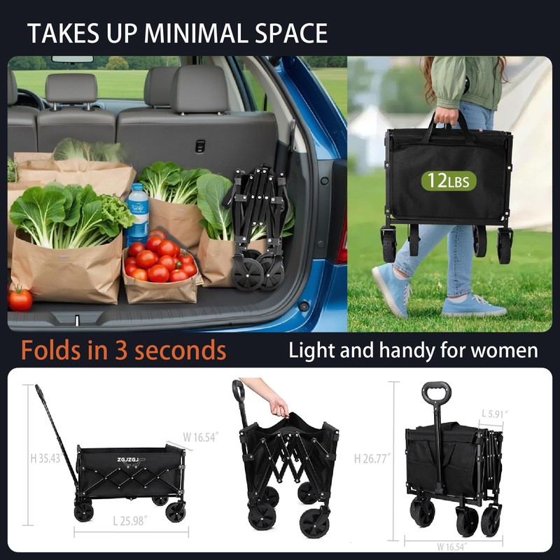 - 【Lightweight & Compact】 This wagons carts foldable only 10.91 lbs and folds to 17.72" x 6.10" x 26.77", easy to store in any car trunk or closet.