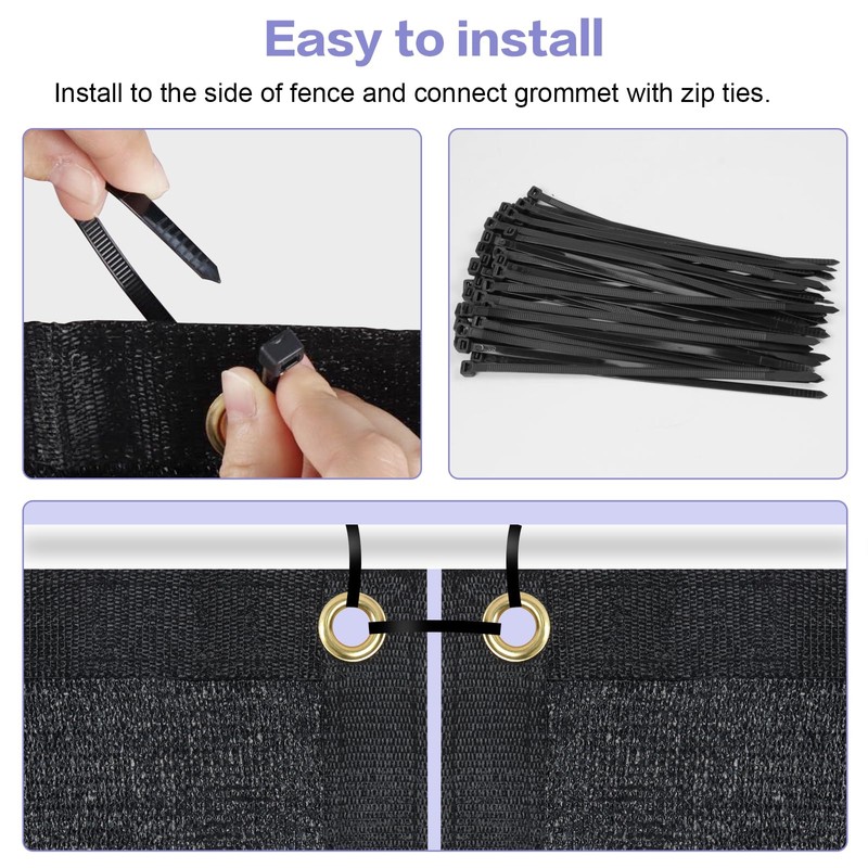 - Easy installation: Simply use zip ties to fasten the grommets to the fence screen, the zip ties are included in the package. Brass grommets are evenly placed on the edge, 12 inches apart vertically, 24 inches horizontally.