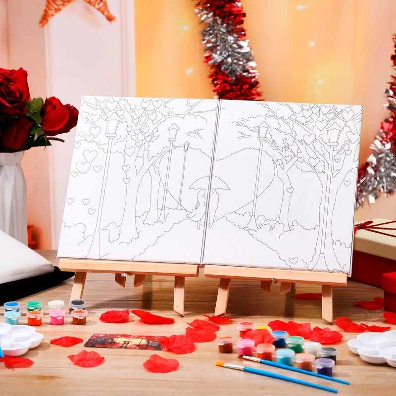 - Generous Package to Fuel Your Artistry: our comprehensive package includes 2 pieces of 8 x 10 inch pre drawn canvases, 2 painting easels, 2 sets of paint strips with 2 sets of brushes, 2 palettes, 1 white tablecloth and 1 red table runner, 2 aprons and a sprinkle of 100 artificial red rose petals, now, imagine the artistic possibilities