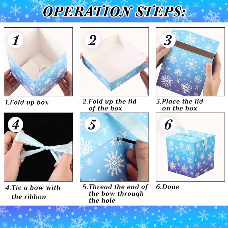 - Exquisite Design: These decorative Christmas boxes are printed with beautiful Christmas snowflake, with red ribbon, to make the holiday full of festive atmosphere, they can meet various packaging needs of activities and parties