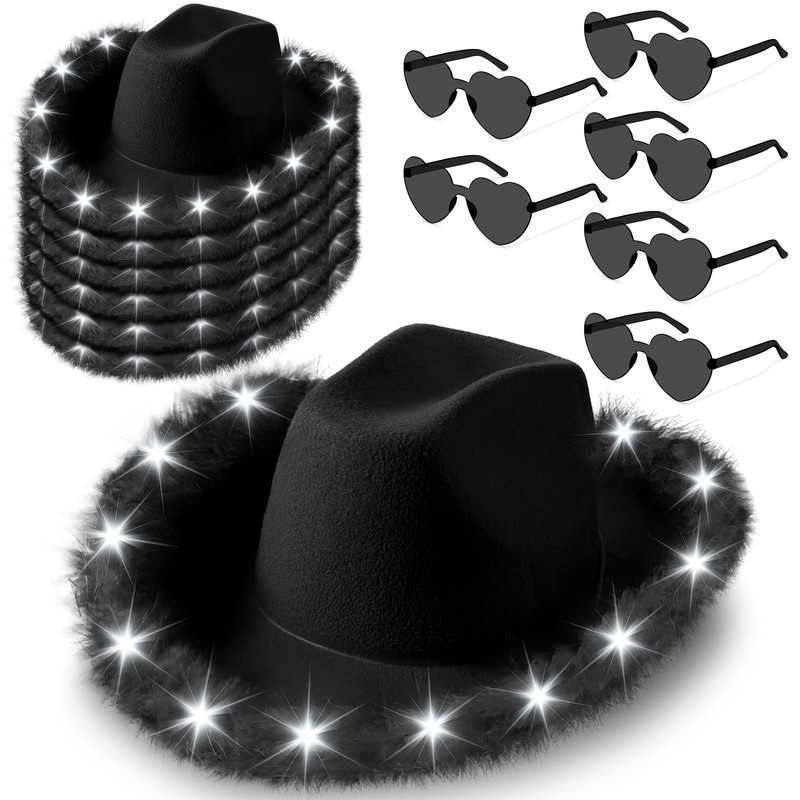 Zhanmai 6 Pieces Cowgirl Light up Hat with Feather Boa, 6 Pieces Heart Sunglasses Set for Girls Bachelorette Costume Party(Dark Purple)