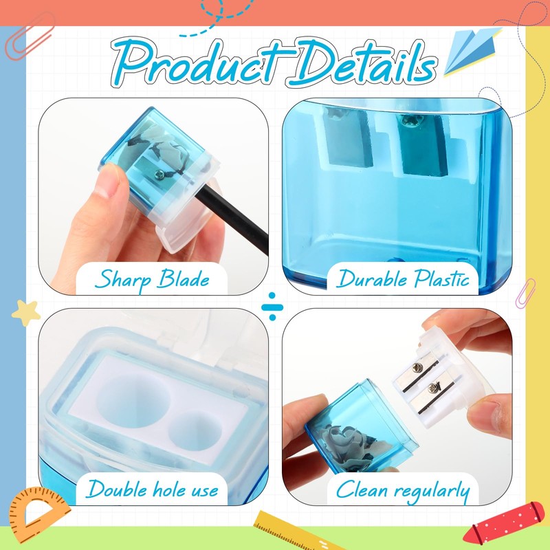 - Dual Hole Design: these pencil sharpeners are designed with 2 holes; The 2 holes have different sizes and can accommodate standard pencils and large size pencils; A pencil sharpener can solve different problems and is a convenient and efficient work tools