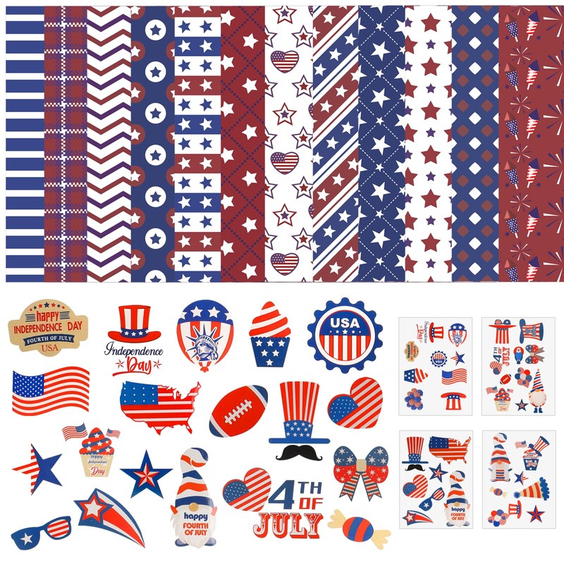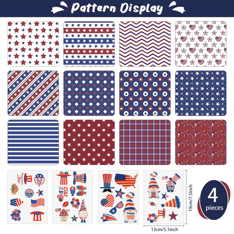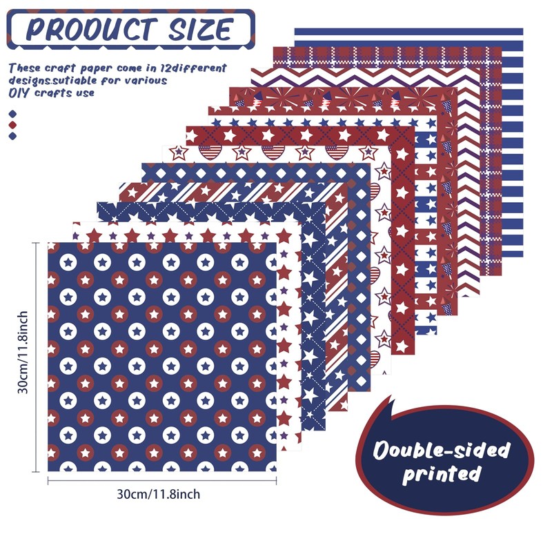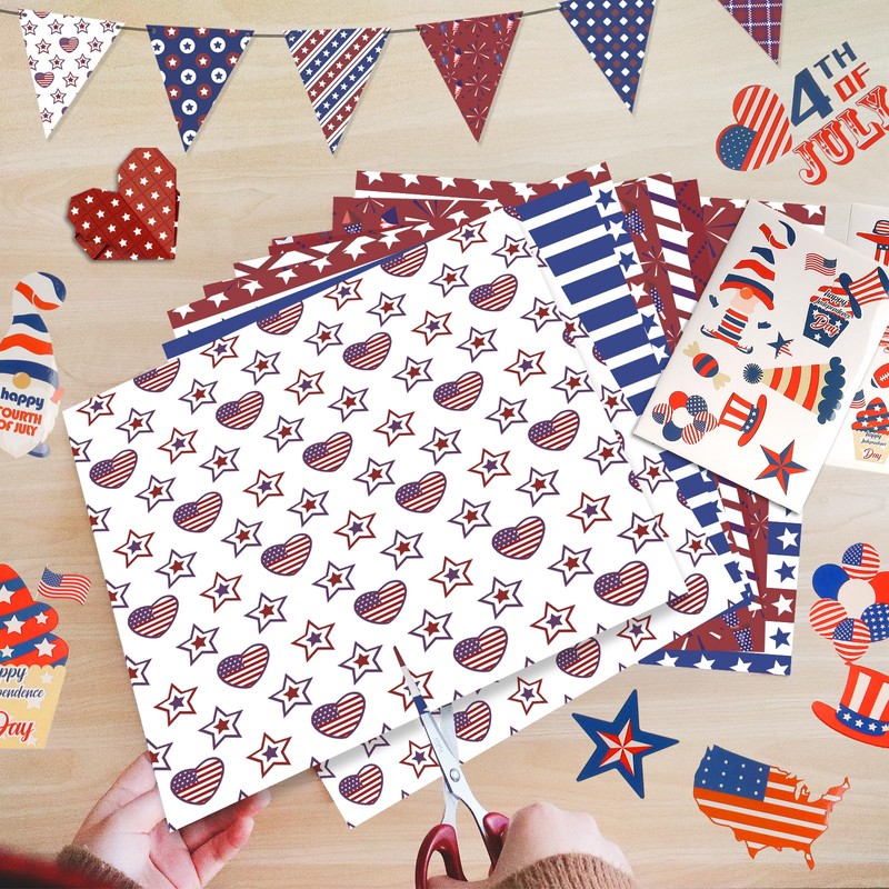 - Material: This collection of 4th of July-themed patterned paper is crafted from paper, each sheet adorned with a distinctive and classic design. The vibrant colors and intricate patterns are creating Independence Day decorations and crafts, infusing your projects with a festive spirit. These papers are easy to manipulate, foldable for various crafting purposes, and versatile enough to enhance a wide range of craft items with a touch of celebratory charm.
