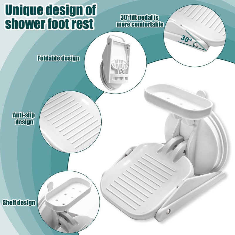 - 【Adjustable Height to Relieve Back Strain】This shower foot rest supports adjustment to any height, convenient for shaving leg hair, washing feet, or drying off, avoiding excessive bending. It is especially suitable for those with mobility issues, pregnant women, and the elderly.