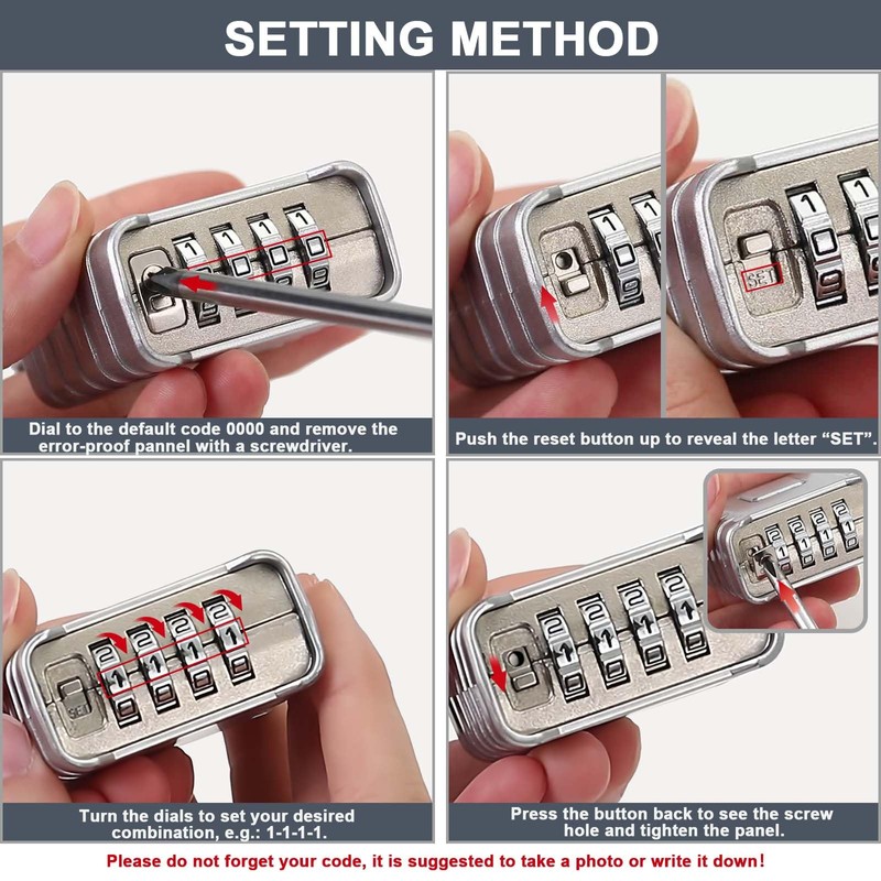 • COMBINATION SECURITY : The lock has a combination disk at the bottom for greater concealment and waterproof performance. To change the password, you need to unscrew the screw, push the setting key upward, see the " SET " key, and then reset the password. This can effectively avoid accidental password changes.