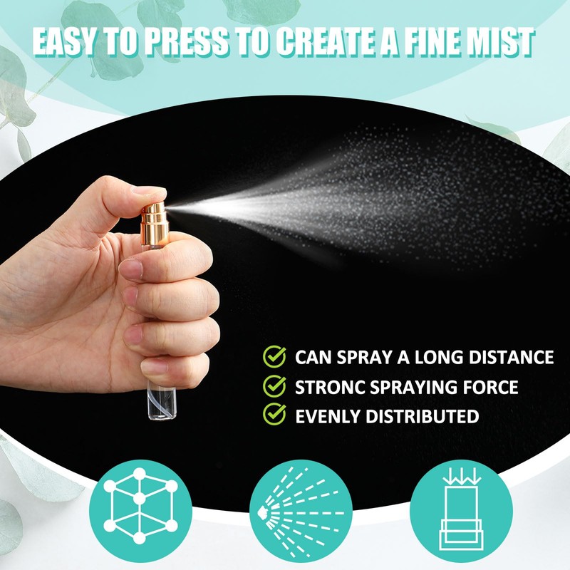 • Material and Fine Mist Design: the mini spray bottle is made of glass, which is refillable and durable; The mini spray bottle adopts nozzle design, which will not block or get stuck; The spring is long enough to squeeze out liquid, the spring button ensures that enough liquid is sprayed, and fine mist is evenly distributed