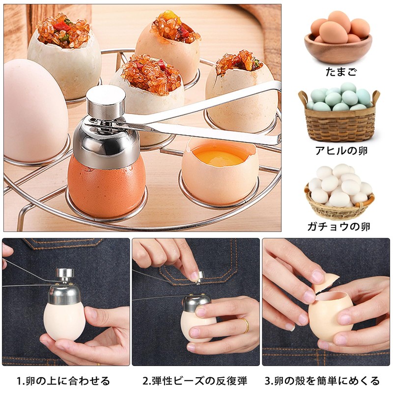 - 【Precise peeling egg】Egg cutter unique and versatile design makes it easy to break soft eggs or hard eggs. 1. Place the egg over the top of the egg. 2. Pull up the lever and then release it to launch it with spring force. 4. The top of the shell is cut cleanly round. 5. Remove cleanly like a lid